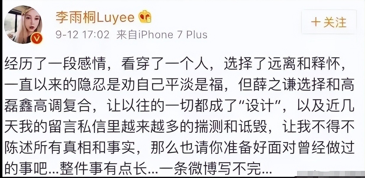 直至2017年,薛之谦于演唱会上高调宣布与高磊鑫复合,这一举动彻底激化了矛盾,当年,李雨桐连发长文爆料,还晒出转账记录、录音、病历等诸多证据。