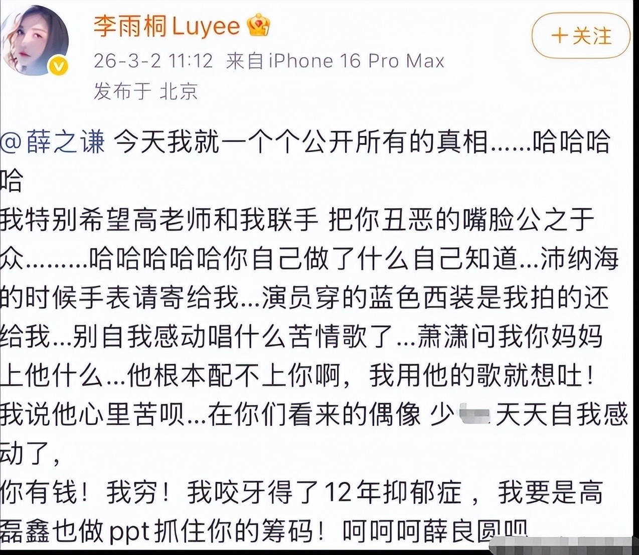 2026年3月2日深夜,原本平静的娱乐圈被一场突如其来的实名举报打破,薛之谦前女友李雨桐突然在微博密集发布二十余条动态。