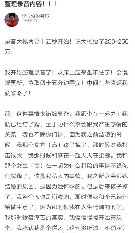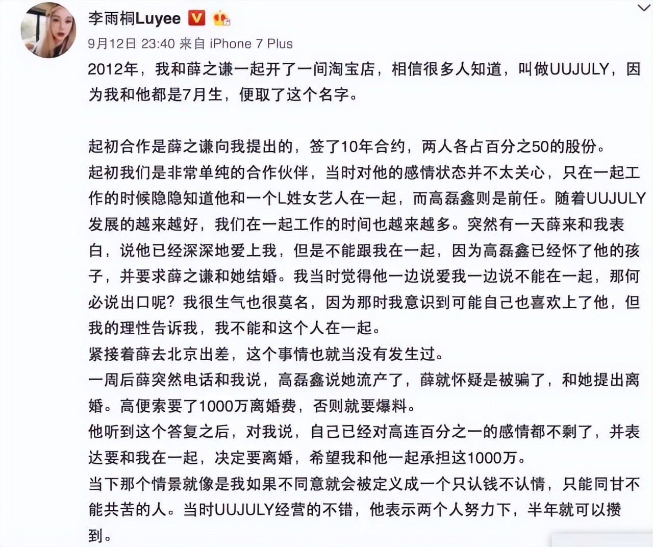 除此之外,李雨桐还指控薛之谦对自己造成了严重的身心伤害,称自己当年怀孕后,被薛之谦以事业发展为由逼迫堕胎,术后还出现大出血的情况,落下了病根。