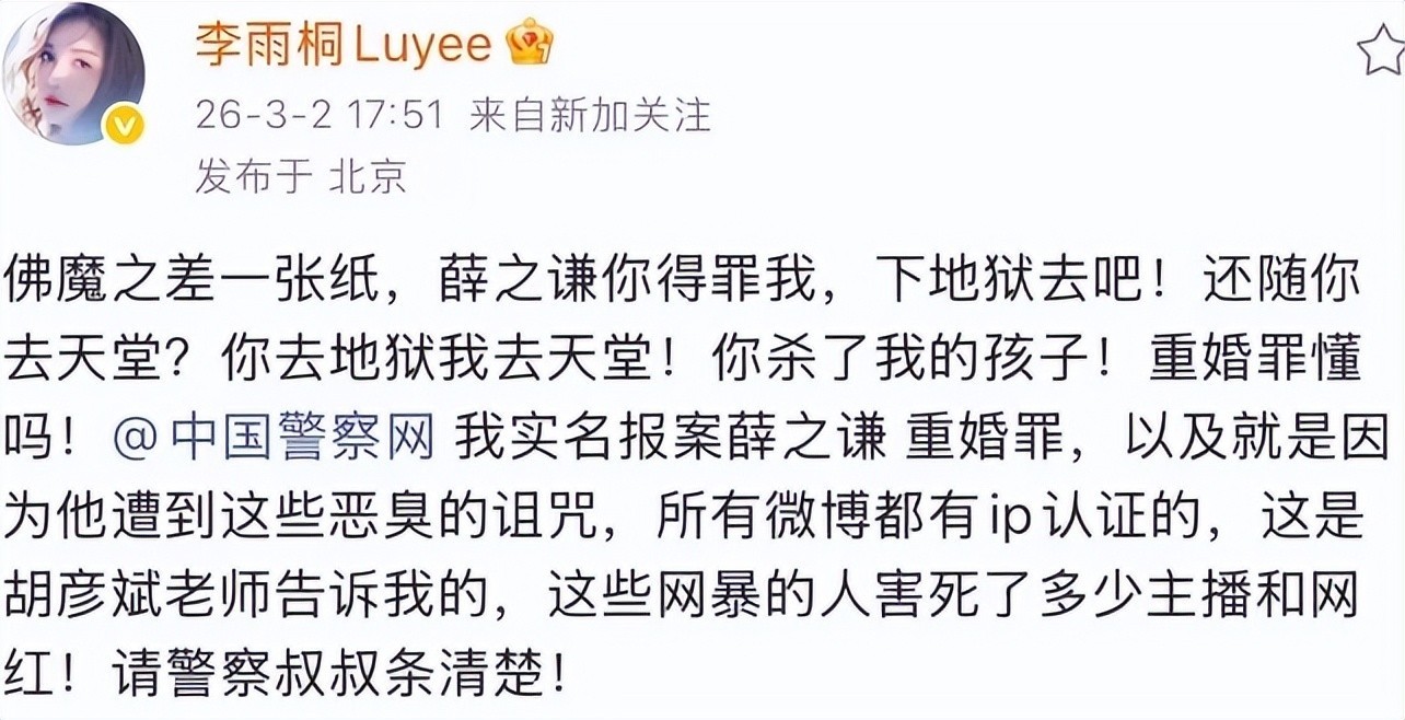 语气激烈且态度强硬,并非以往娱乐圈常见的私下辩论,而是直接实名举报薛之谦涉嫌重婚罪,字字句句都带着不容置疑的决绝。